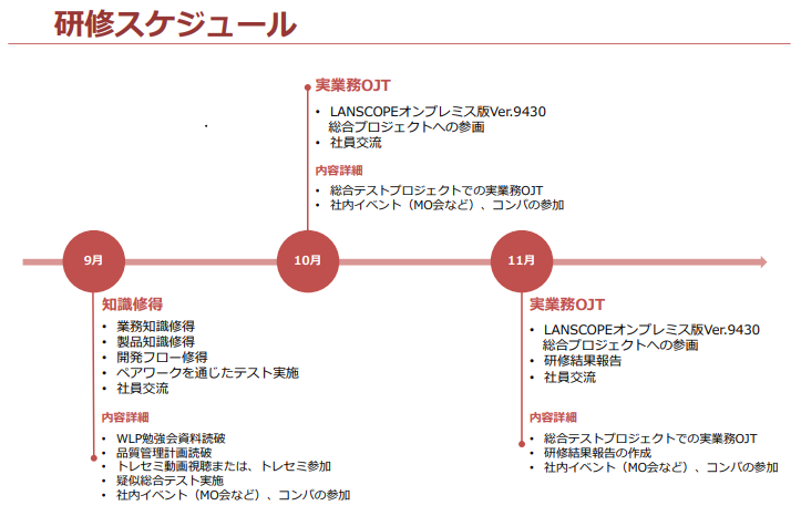 私は9月に入社し、11月までの3か月間、次のようなスケジュールで実施されました。