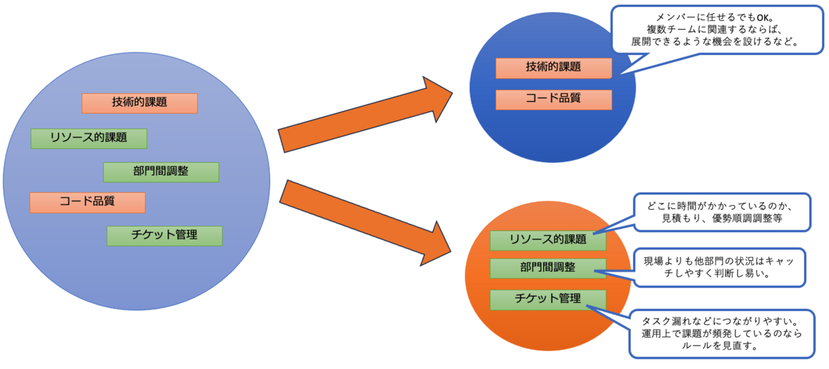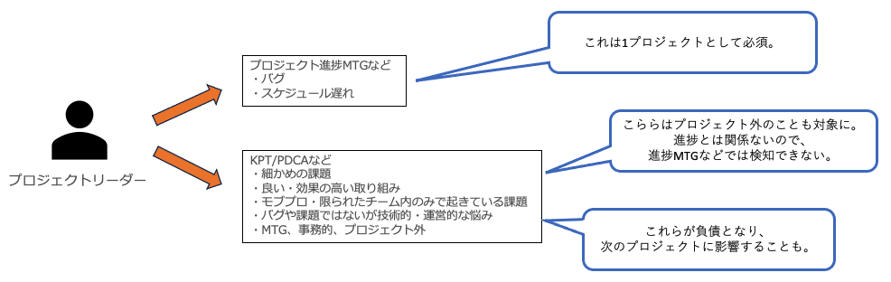 プロジェクトリーダーはそれらに対して「管理・長期的な目線」から影響・効果を見て調整、スケジュール配置、上位層へのエスカレーションをすることが大切です。